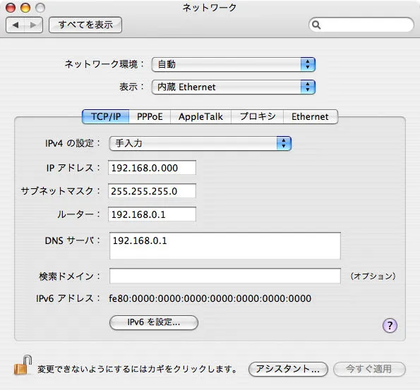 VNCのサーバを動かすのにMacのIPを変えたくなかったので、固定するように変更した。いまいちやり方がわからず詰まってたけど、スクリーンショットのように 「手入力にしてDNSサーバのIPを入れたら」 動くようになった。初めはDNSサーバの所が空白になっていて、空白のままやろうとしてたので繋がらなかった。よく分からんけどとりあえず動いたので良し。外に公開するわけじゃないから、デフォルトのままでセキュリティも大丈夫だろう…。