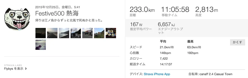 去年Festive500の序盤からぶっちぎりで、最後まで1位をキープしてた超人が関西の方にいて、今年どうするのかな?と思ってたら直前で怪我したみたいで不参加になってた。