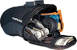 サドルバッグはトピークの小さいやつを使っている。これもサイパラに置いてあった中古品で、取り付けマニュアルとか無くカバンだけの状態で買ってきた。サドルバッグやトピークについてよく知らない頃だったのでこの向きに取り付けていた。