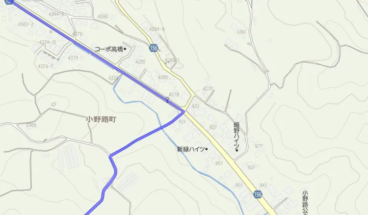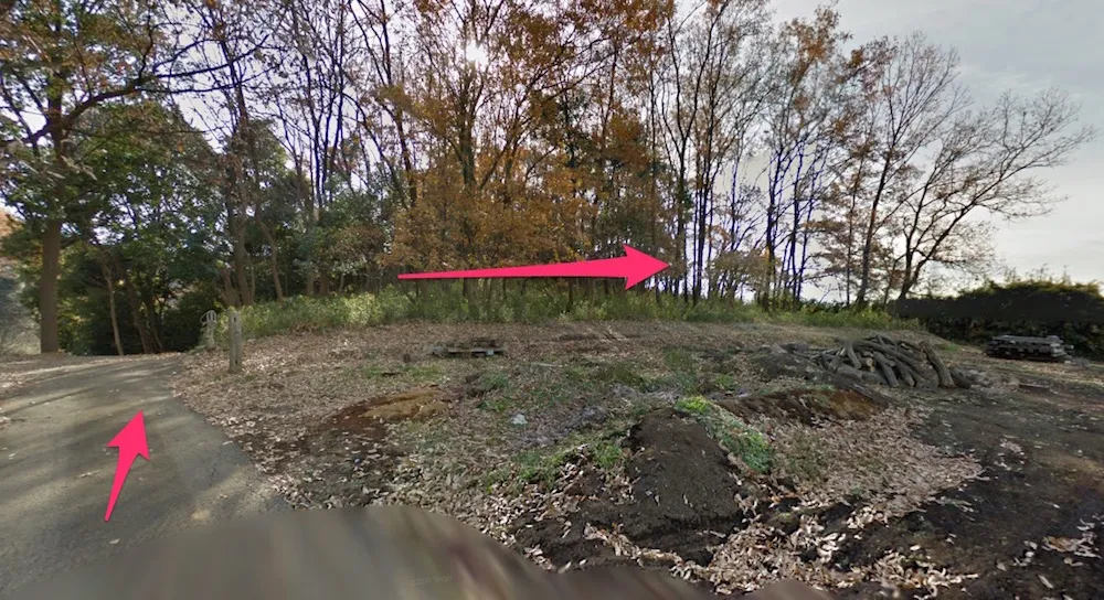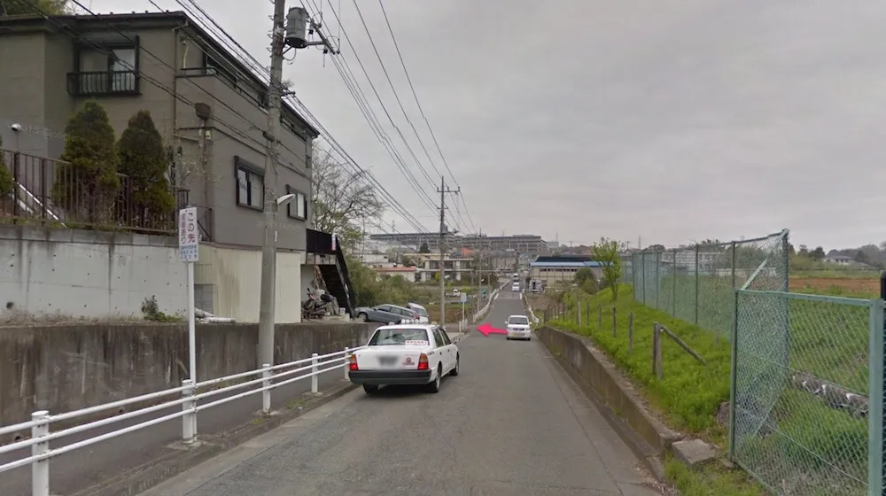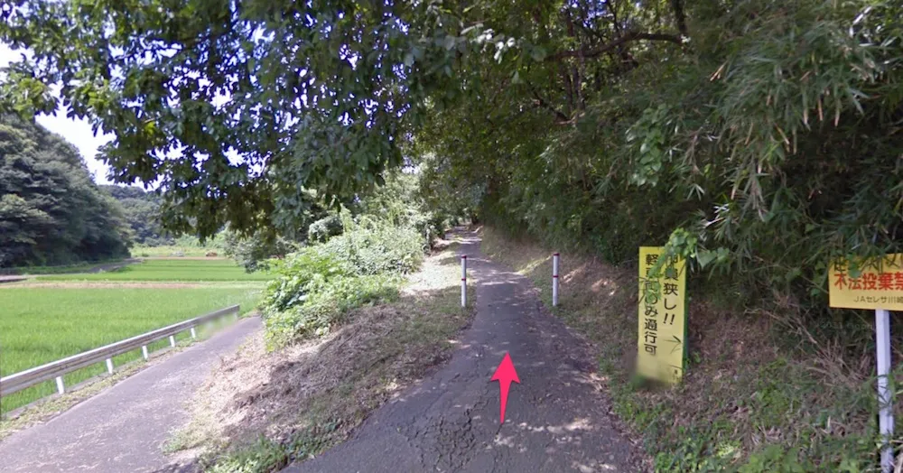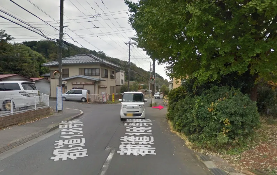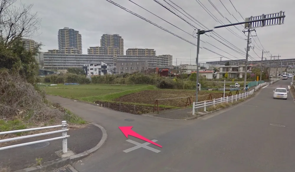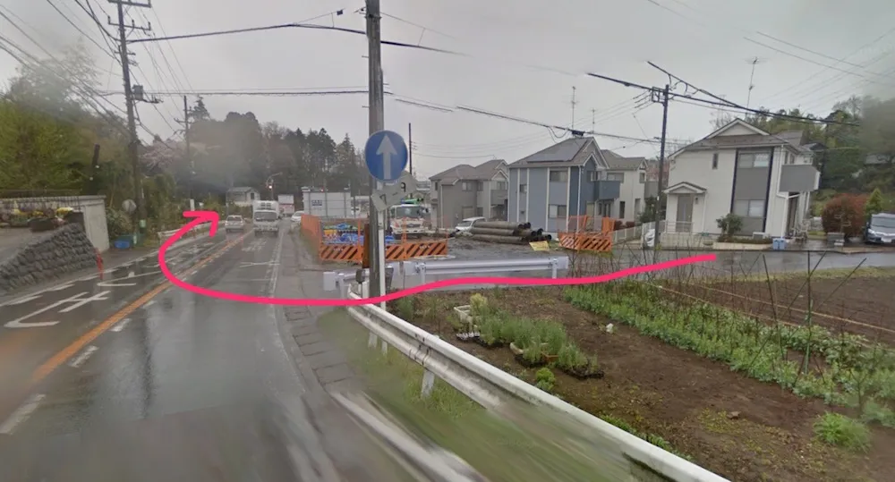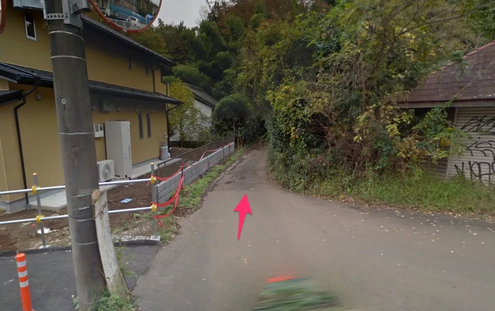 国士舘大学のグラウンド脇を抜け、二車線になっている道路を下り、右手にセブンイレブンのある「別所」という交差点を左に入る。ストビューで見ると山道のようになっているが、この道路沿いにいくつか民家があり、上のほうにも家が集まっていたりするので車もそこそこ通る。
