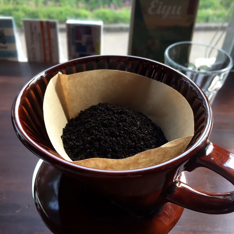 しばらくゴリゴリ挽いて、自分でお湯を適量入れて完成。窓際でちょっと暑かったせいか知らぬ間に扇風機が置かれていた。
