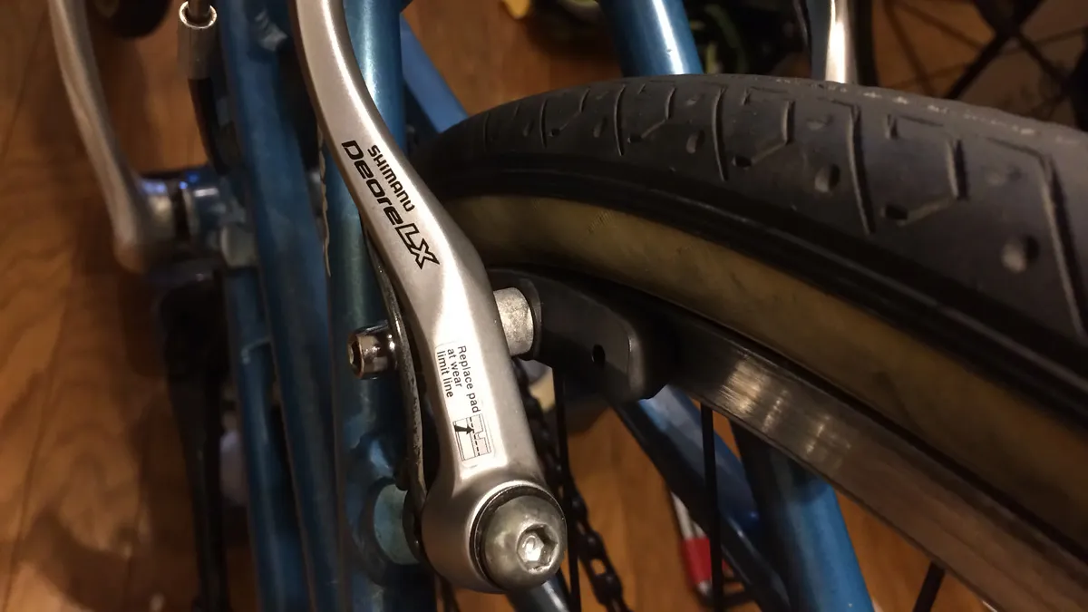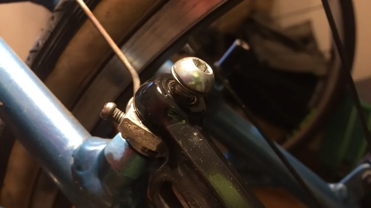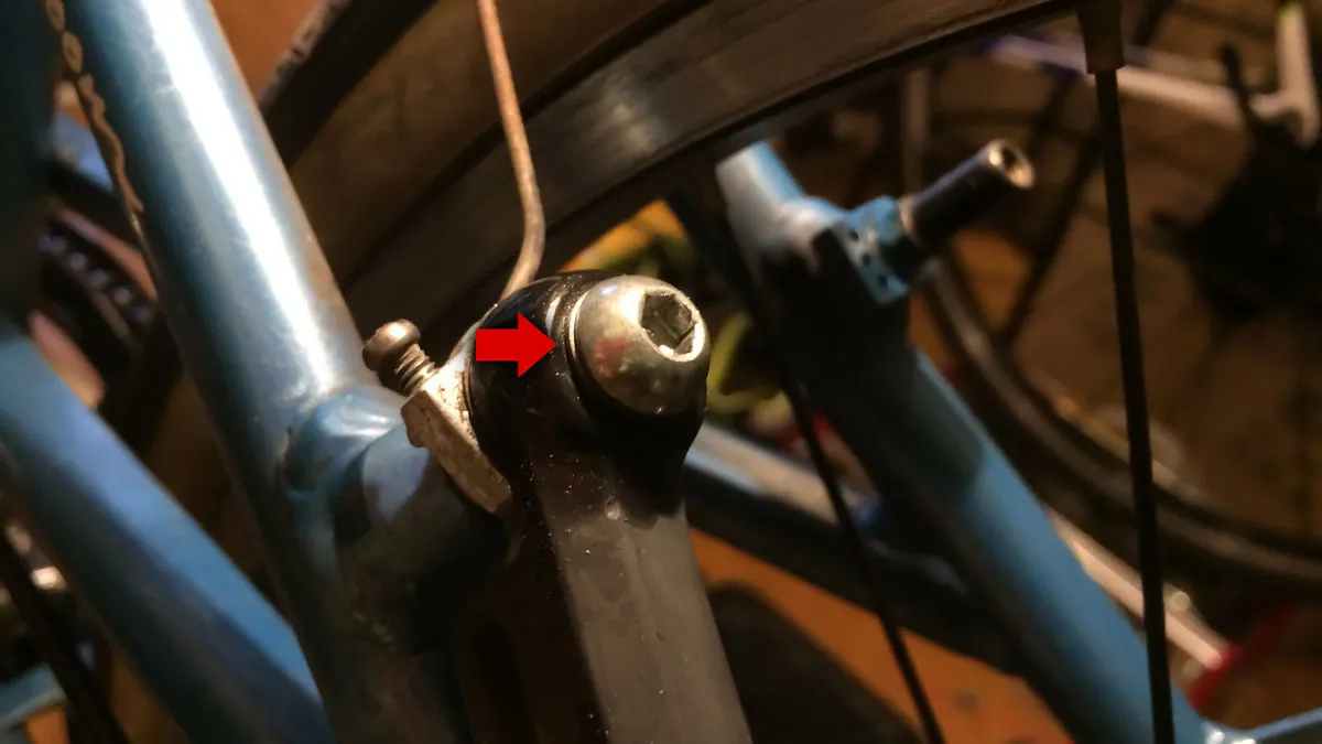 Vブレーキを外すのは初めてなので部品の構成がよくわからない。とりあえずフレームとの固定に使われてそうなネジを六角レンチでひねってみると、少し緩んだところでなぜか締まる感じがする。逆ネジ?と思って締めてみると、元の場所で締まって止まる。