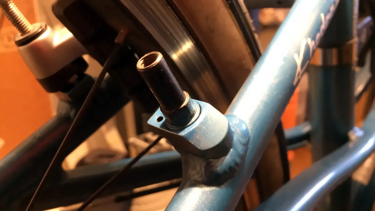 緩めた時にブレーキとフレームの間に少し隙間が空いたので、CRE556を吹いて再度緩めてみる。グルリと回って外れたが、上の写真のような状態になってしまった。