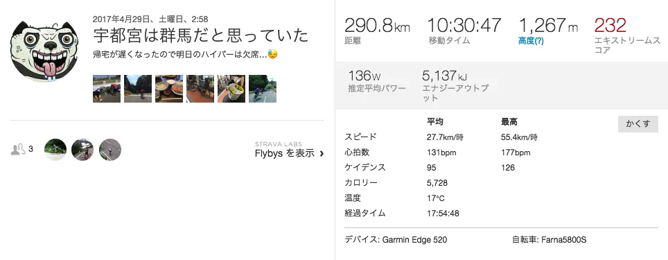 CWS吉祥寺のお店の人にお声掛けいただいて宇都宮まで行ってきた。お店に朝3時集合だった。宇都宮まではほぼ平地で、300km近く走ったのに獲得標高が1000mちょっとだった。