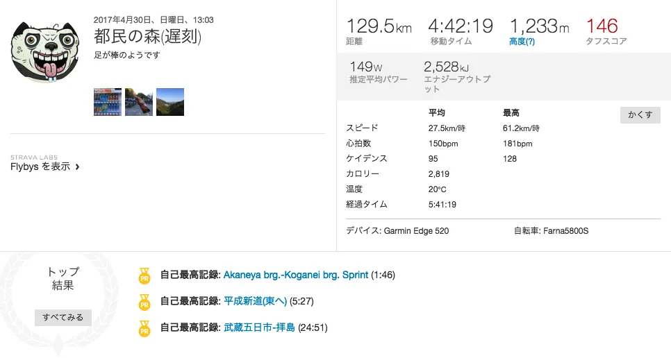 コンビニを出たのは18時半頃で、荒サイに入る頃には真っ暗になってしまい、街灯のない濡れた路面を恐る恐る走って帰宅した。家についたのは21時近くだった。おつかれさまでした。