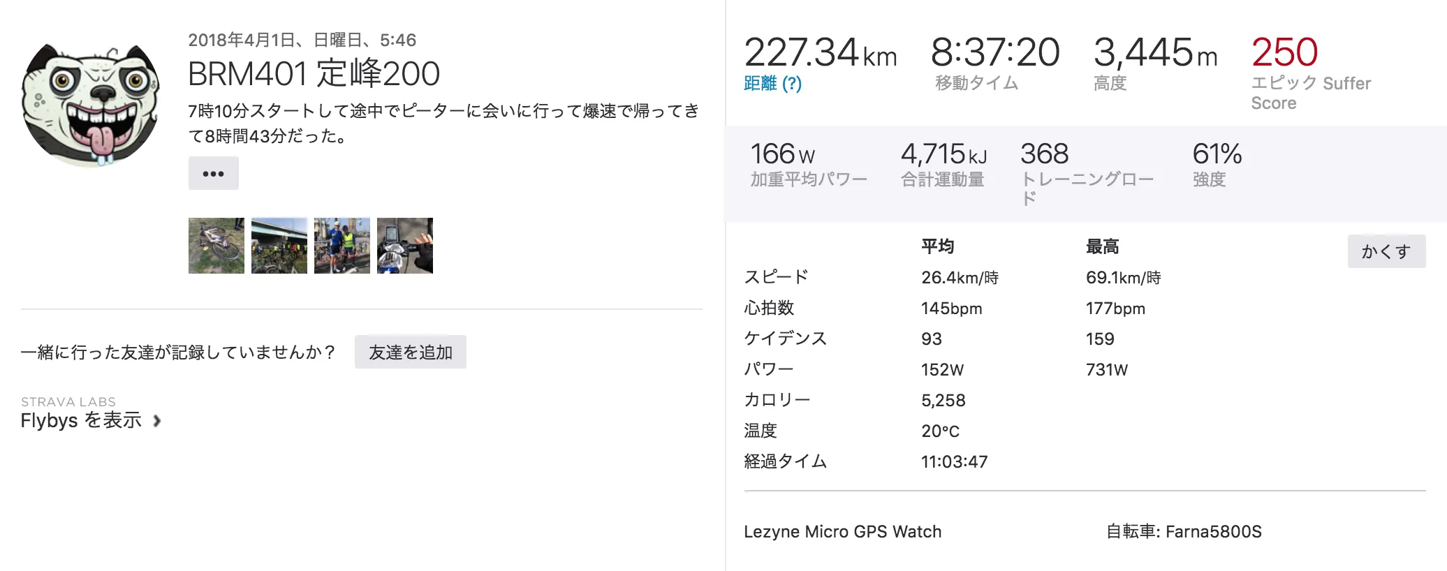多摩サイから先はずっと向かい風だったが、上体を低くして何も考えずに220wで踏んでいた。ゴールの癒しふれあい館に着くと5番目くらいで、8時間43分と目標の9時間が切れたのでよかった。