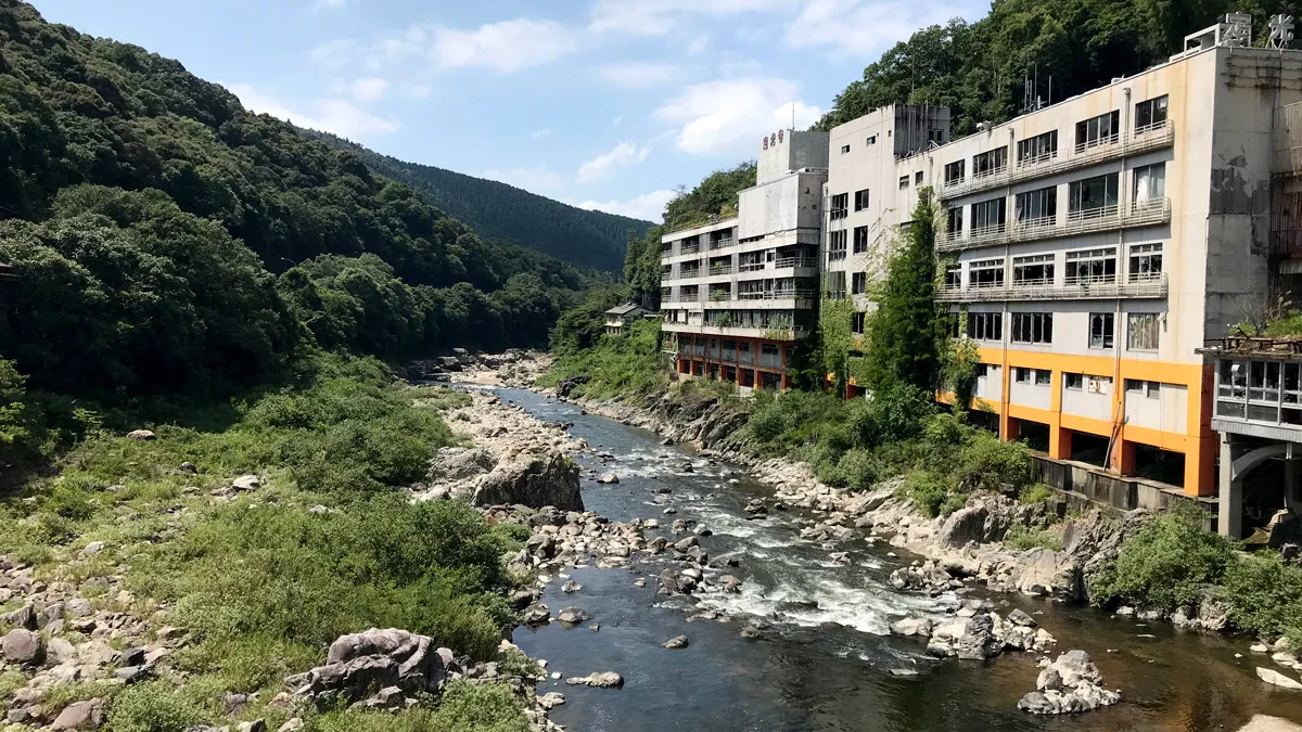 千歳楼。きれいな景観だがホテルの窓は全部割れている。Wikipedia によると不審火、火事、心霊スポットという単語が並んでいていろいろ察するものがある。また、同ページに「車が発達する前は名古屋の奥座敷とも呼ばれていた」とあり、景観の良さもあいまってよくわかる話である。