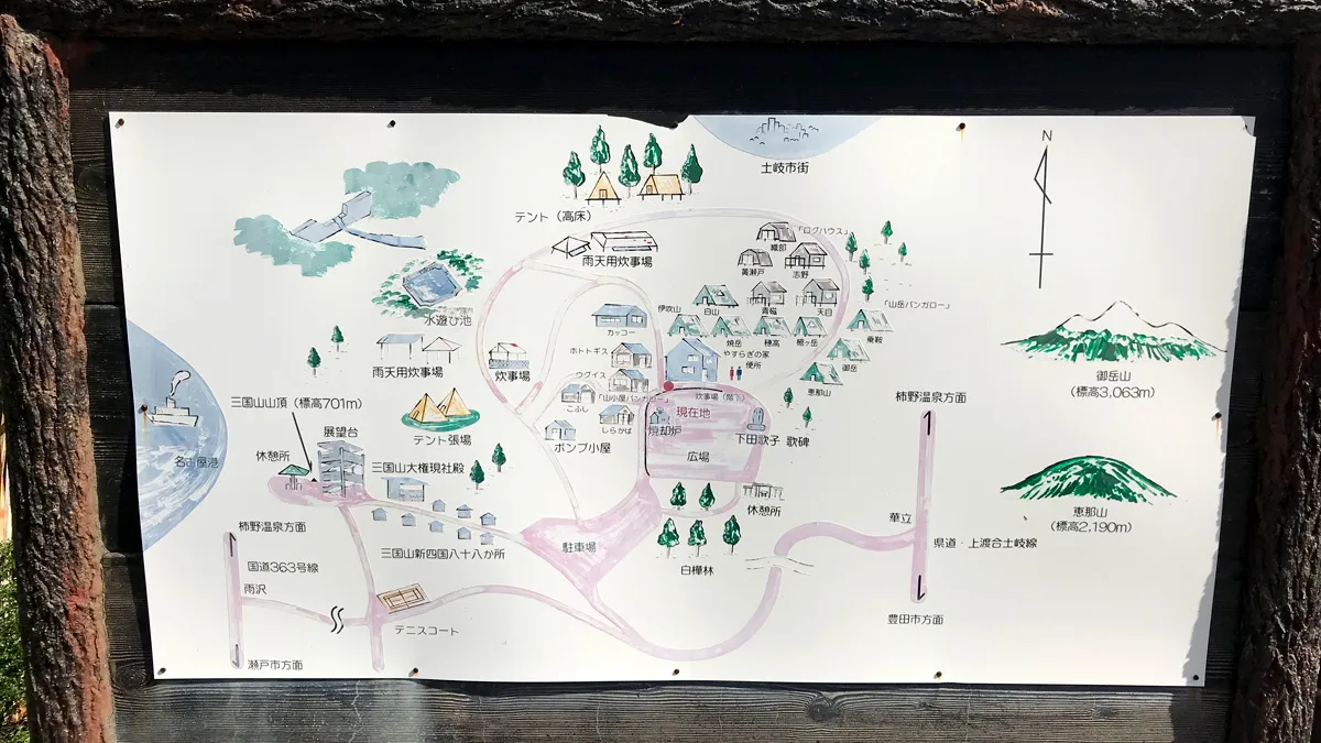 キャンプ場の地図。この後ろにいくつかバンガローが見えた。8 歳くらいの頃にここで子供会のキャンプをしたことがあり、ゆるい斜面にテントを張って寝たのを覚えている。この日は上の広場に 3 家族くらい、下のバンガローにも 3 家族 or 友人連れでキャンプしている人がいた。静かでいいところ。
