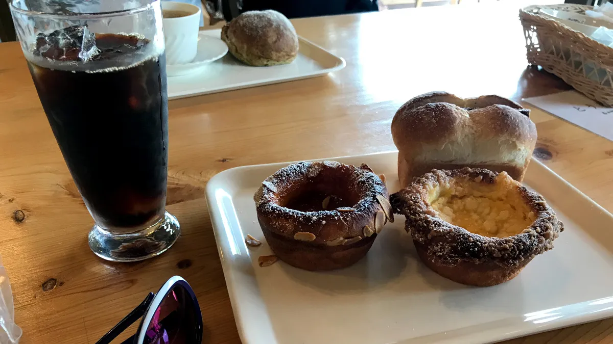 9 時に曽木の Kattan へ。母親と待ち合わせしていて店内でパンを食べてきた。去年も店の前を通っていたが、「店舗が奥まった位置にありよく見えない」「R363 から見える看板がなんか変(アラジンみたい)」という理由でスルーしていた。Google マップのレビューを見たらすごい人気だったので今回寄ることにした。バイクラックもあり、テラス席もあり、完全に自転車フレンドリー。パンもうまいし母親も喜んでいた。あと店先にあったロゴはかわいい感じのものだった。