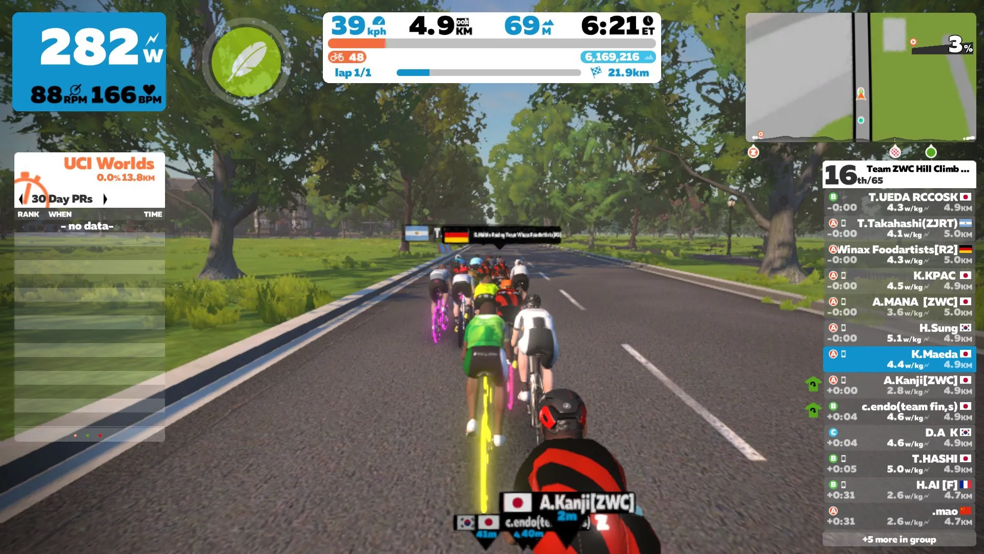 を頭に入れておいた。とりあえず川上乗までに先頭付近に行かないとダメなわけで、どうしようかなとタイミングを見ていたらダズル迷彩みたいなジャージの人が上がっていったのでついて行くことにした。彼が A.Kanji [ZWC] だったと後で知ることになる…俺はZWCに詳しいんだ。前半の細かい坂までは覚えていないので、時計を見ながらちょっとずつ前に出ていった。