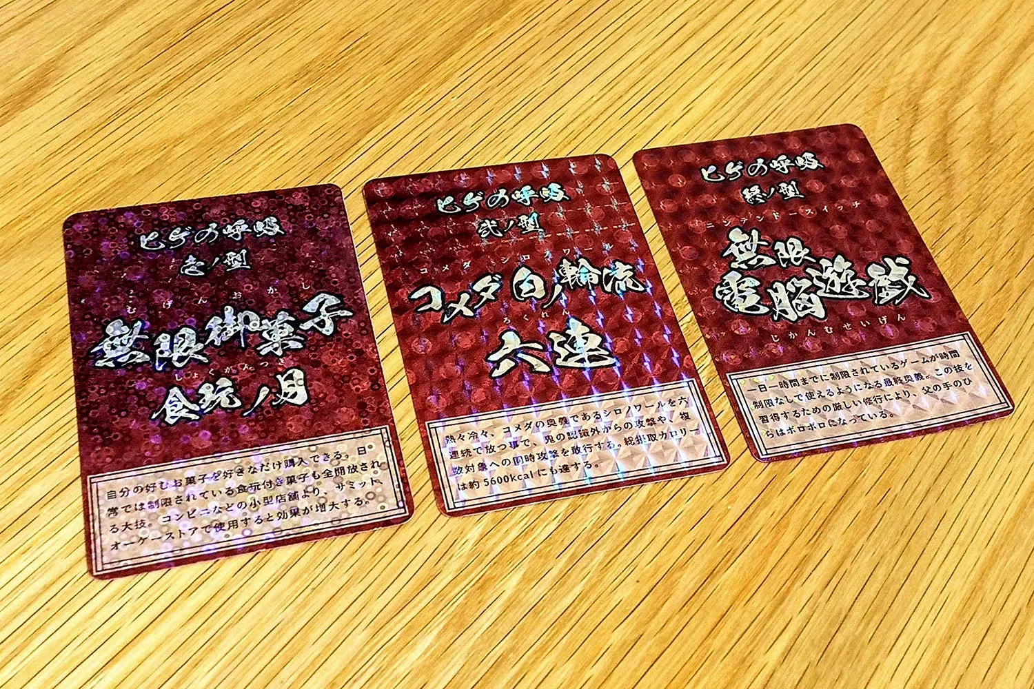ちょうど鬼滅の遊郭編も始まり子どもたちが盛り上がっている。あと鬼滅フォントがAdobeから公開されたので必殺技カードを3枚作った。お父さんのパワーがたまると祭のどこかで必殺技を撃ってくる。