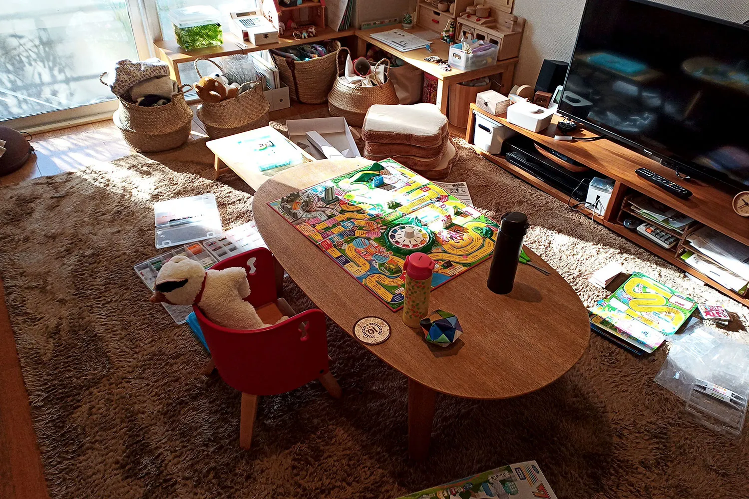 初日の朝から人生ゲームを出して遊んだ。1〜2時間くらい遊んだが、片付けできないのでいきなり部屋が狭くなる。片付け禁止の制限にビビって、普段おもちゃを出しては片付けない子どもたちが、そもそもおもちゃを出さなくなった。