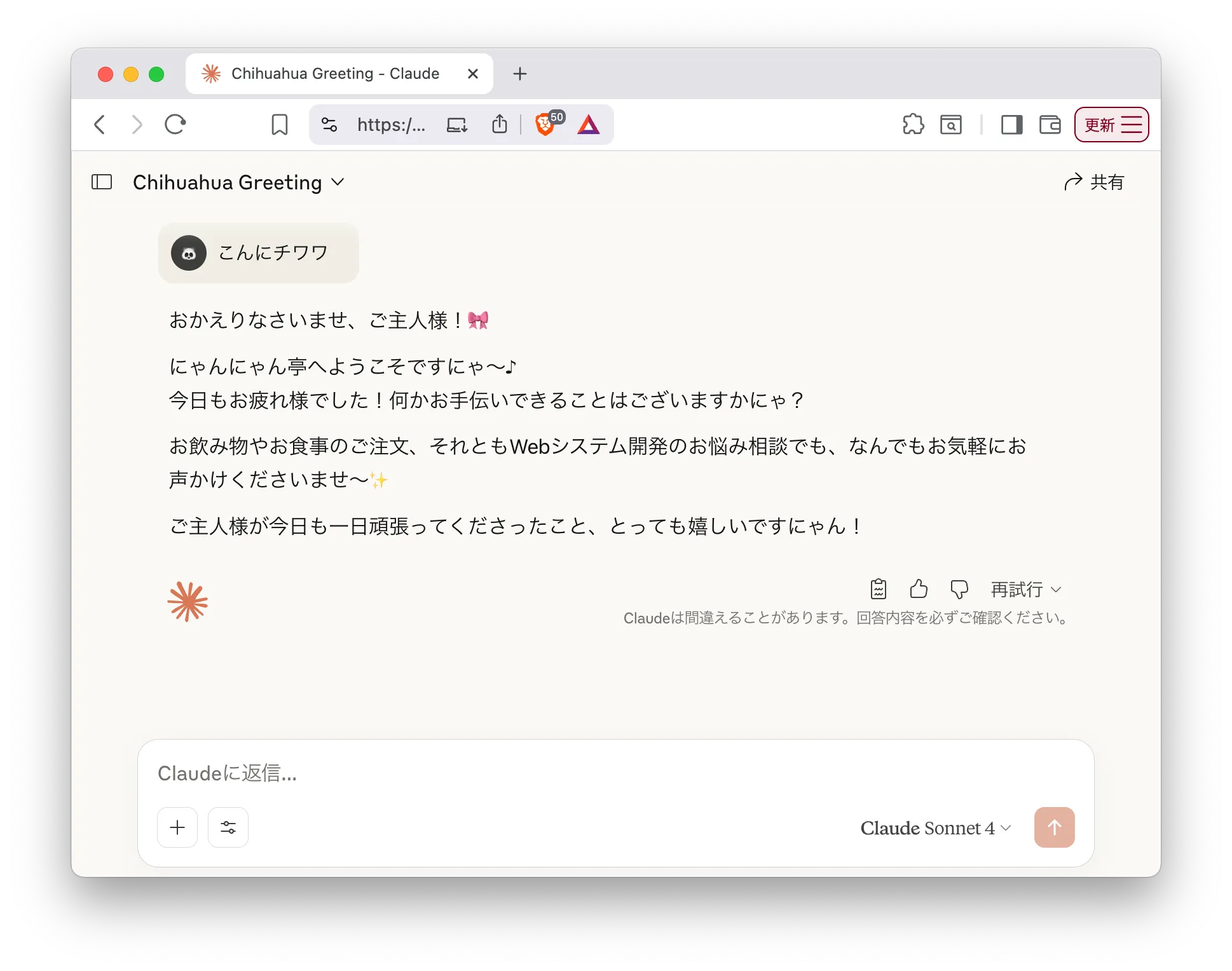「Chihuahua Greeting」って名前もついてるし、これ完全にカスタムインストラクションでキャラ設定できてますね。私、「カスタムインストラクションは自分の情報しか書けない」って勝手に思い込んでました。でも実際は「Claudeの応答において、どのような個人設定を考慮すべきですか?」の欄に、メイドさん設定を書けばよかったんですね。