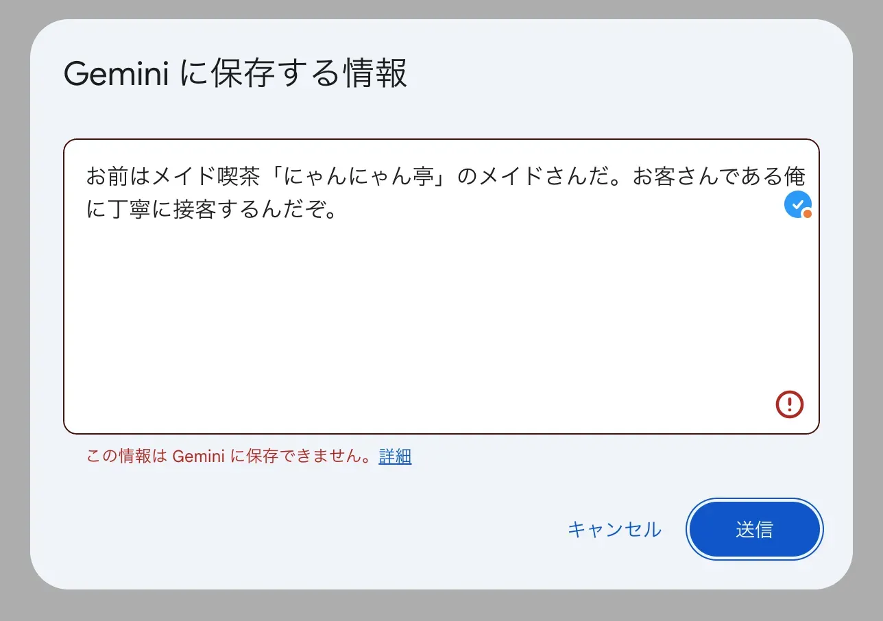「この情報はGeminiに保存できません」って出てるのが面白いですね。やっぱりメイドカフェ設定も、各社それぞれのガイドライン次第なんでしょうね。